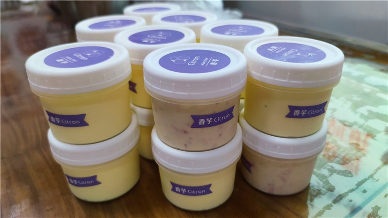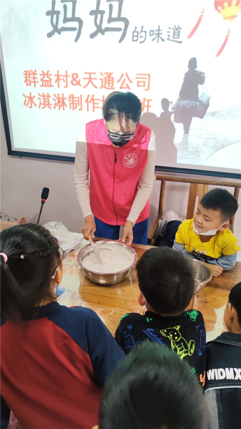 提及冰淇淋,現場的小朋友一個個興奮得歡呼雀躍。商場里出售的冰淇淋中多含有較多的添加劑,如何給孩子制作一款無添加劑的冰淇淋成了這堂親子互動課的目的。群益村美食老師現場講解打發雞蛋及雞蛋牛奶混合液的過程,演示打發淡奶油、攪拌混合,加入果醬等改變口味的方法和分裝小瓶等步驟。期間大家認真聽講解,小朋友們眼睛牢牢地盯著講臺,仔細觀察每一個步驟,還時不時地向美食老師發問,興致高漲。孩子們一邊品嘗著冰淇淋,一邊在自己的冰淇淋罐盒上貼上自己所愛口味的標簽后讓美食老師裝滿剛做的冰淇淋,跑前跑后忙得不亦樂乎!