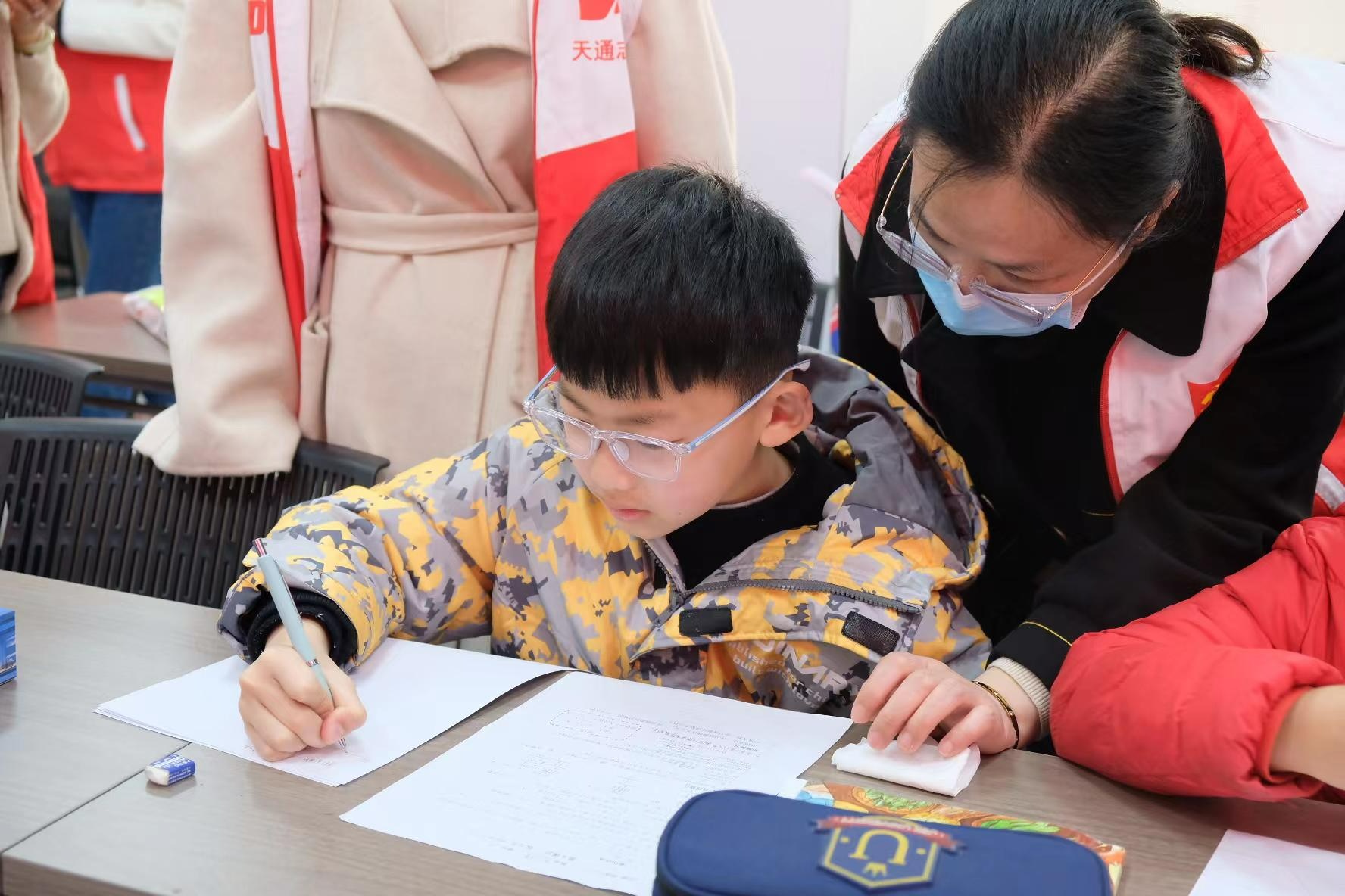 陽(yáng)春三月,春風(fēng)暖心,上午8點(diǎn),天通黨群服務(wù)中心培訓(xùn)室成了孩子們溫馨的學(xué)習(xí)場(chǎng)所,青年志愿者們正在輔導(dǎo)孩子們做作業(yè)。只見孩子們圍坐一起,低著頭認(rèn)真寫作業(yè)。遇到難題時(shí),志愿者便耐心地與孩子們共同探討,幫助他們找到解題思路,培訓(xùn)室中時(shí)不時(shí)傳來(lái)志愿者們與孩子們的低語(yǔ)討論聲。